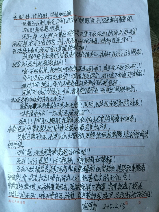▲连恩青给家人的信中表示对死刑没有惧怕,反而感觉是荣耀和期待。