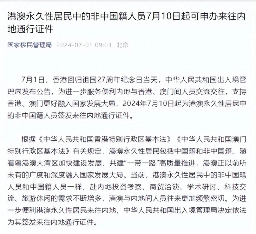 7月1日,香港回归祖国27周年纪念日当天,中华人民共和国出入境管理局发布公告,为进一步服务便利内地与香港、澳门间人员交流交往,支持香港、澳门更好融入国家发展大局,2024年7月10日起为港澳永久性居民中的非中国籍人员签发来往内地通行证件。