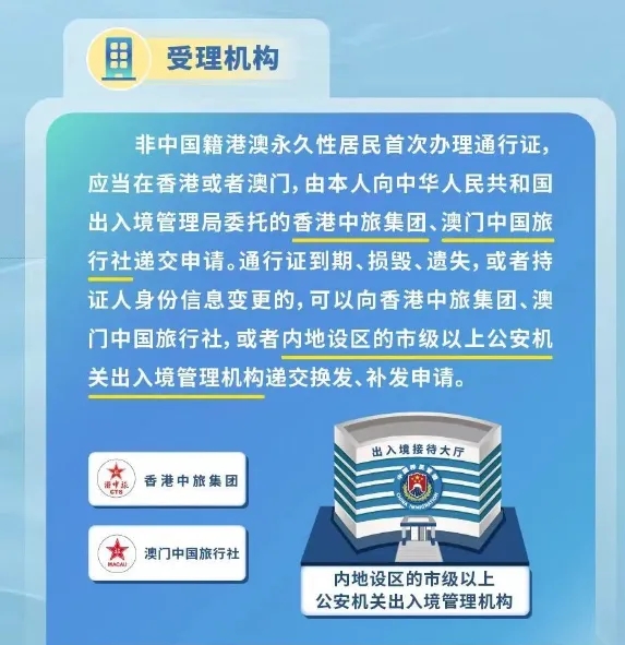 中华人民共和国出入境管理局有关负责人介绍,港澳永久性居民中的非中国籍人员可自愿申办港澳居民来往内地通行证(非中国籍),首次申办通行证,由本人向中华人民共和国出入境管理局委托的香港中旅集团或澳门中国旅行社提交申请;在内地停留期间遇到证件到期、损毁、遗失情况,可以由本人向内地设区的市级以上公安机关出入境管理机构申请换发、补发,也可以办理出境证件出境后向香港中旅集团、澳门中国旅行社申请换发、补发。