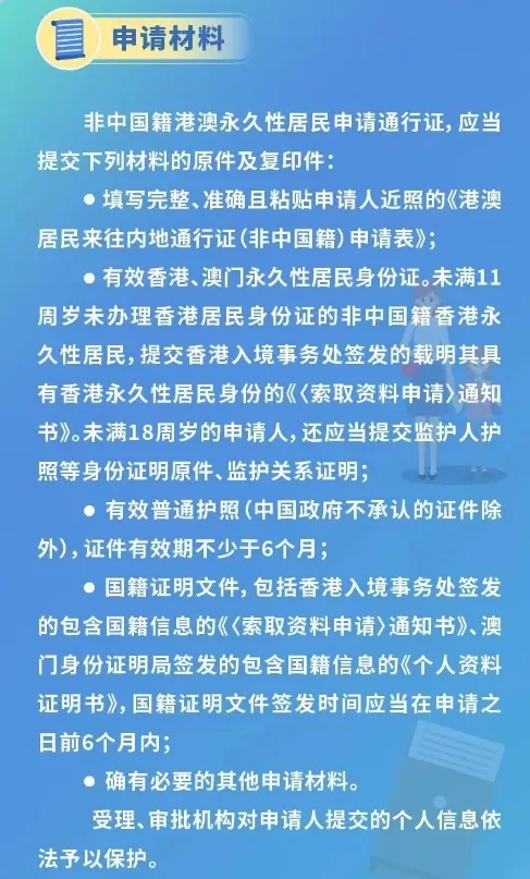 根据《中华人民共和国香港特别行政区基本法》《中华人民共和国澳门特别行政区基本法》有关规定,港澳永久性居民包括中国籍和非中国籍。随着粤港澳大湾区加快建设发展,共建“一带一路”高质量推进,港澳正以前所未有的广度和深度融入国家发展大局。当前,港澳永久性居民中的非中国籍人员和中国籍人员一样,赴内地投资考察、商贸洽谈、学术研讨、科技交流、旅游休闲的需求不断增多,港澳与内地间人员往来更加频繁密切。为进一步便利港澳永久性居民来往内地,中华人民共和国出入境管理局决定依法为其签发来往内地通行证件。