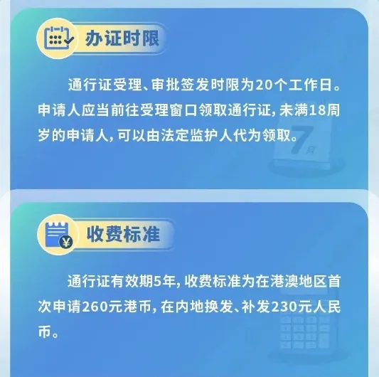(二)通行证有效期5年,收费标准为在港澳地区首次申请260元港币,在内地换发、补发230元人民币。