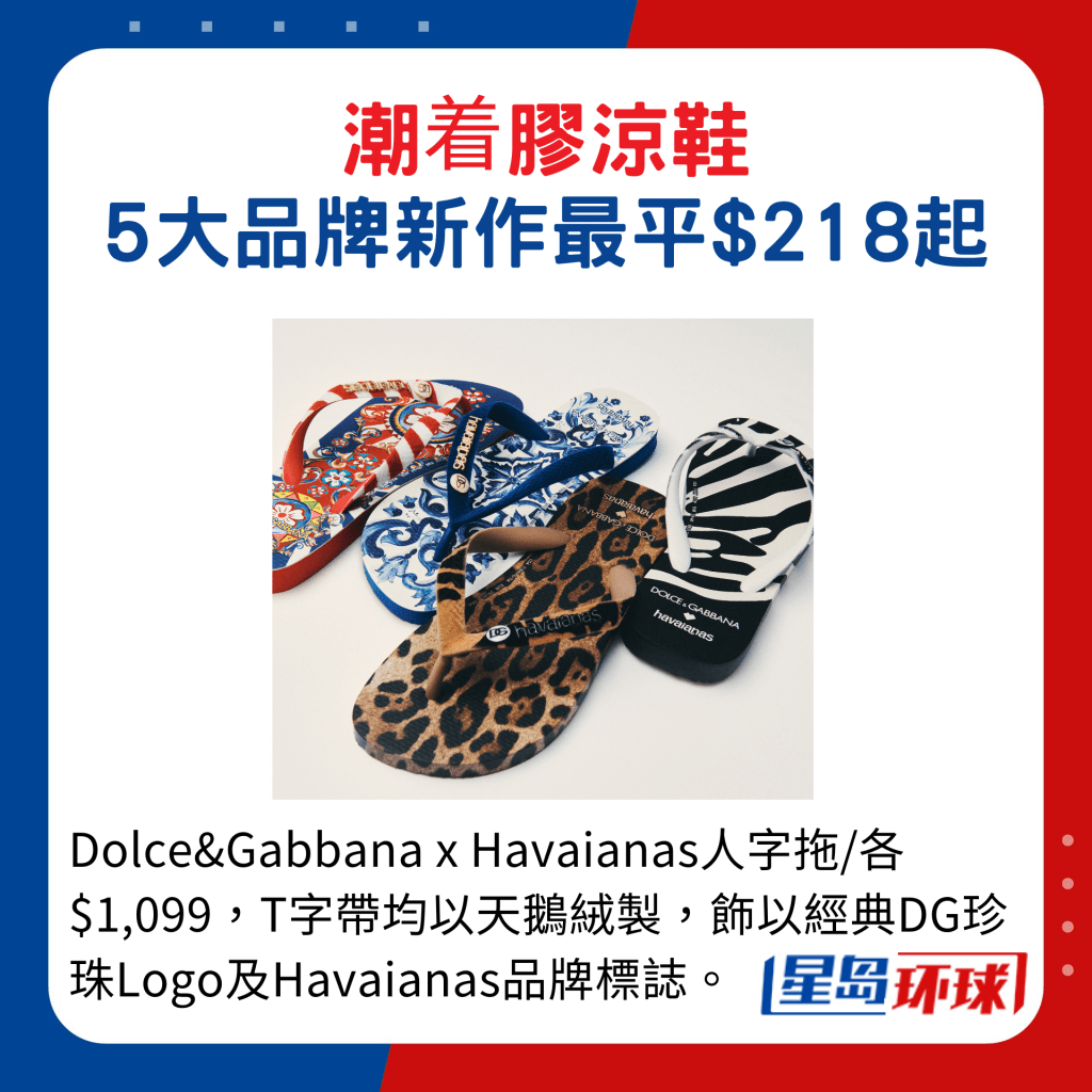 夏日穿搭离不开短裤及裙装,配衬一对胶凉鞋更可添季节色彩。巴西品牌Havaianas拿手的人字拖,今季大玩Tone-on-tone及撞色设计,主打鲜艳色彩,活泼又抢眼。新系列的另一焦点,就是与意大利品牌Dolce&Gabbana合推的首个联乘系列,全以Havaianas经典Top人字拖鞋为设计蓝本,每款的人字带以天鹅绒面料制作,配搭DG珍珠Logo缀饰,提升格调。鞋身则大玩图案设计,包括豹纹及斑马图案,还有受意大利马爵利卡陶器启发的蓝白地中海风格印花(Majolica Blue Mediterraneo),以及西西里岛传统手绘马车的斑斓色彩Carretto Siciliano印花,增添艺术气息。