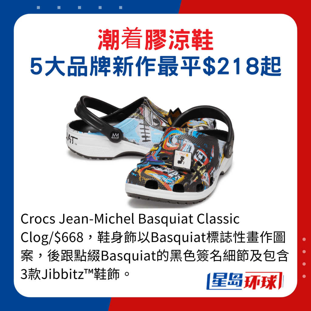 Crocs今季的Artestar系列新作就用上艺术家Jean-Michel Basquiat、Keith Haring及Kenny Scharf的标志性创作,结合品牌的经典Classic Clog及Mega Crush Clog鞋款,藉以向这些艺术家致敬,感觉焕然一新。