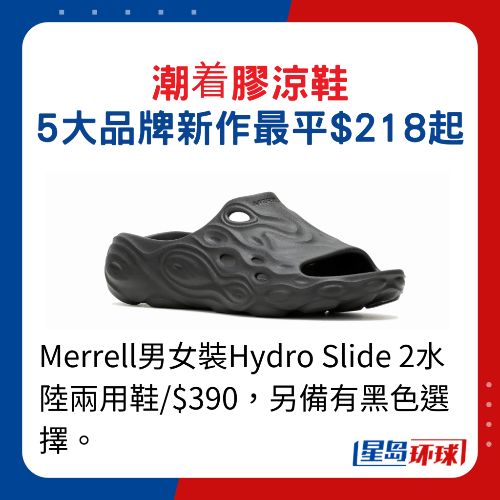 打造轻盈鞋面,部分配搭Max Cushioning及Arch Fit技术,既舒适又提供支撑力。另外,美国户外鞋履品牌Merrell全新的Hydro Slide 2,外形延续Hydro Moc的设计特色,鞋面的镂空洞孔具透气及疏水功能,加上採用轻量EVA泡棉制作,兼具缓冲及稳定性。