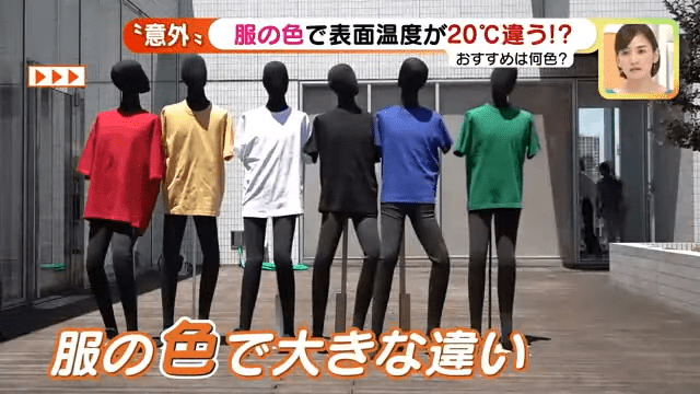 日本夏天炎热程较香港有过之而无不及,为了消暑解温,大家都会从衣着上入手,除了穿得透薄“少布”,颜色原来对于“吸热度2有重要影响。日本电视节目《メ~テレニュース》就曾经进行了一个实试,把6件质地一样而不同颜色的Tee置于正午12时30分的太阳底下曝晒,再于2.5分钟、5分钟后,以红外线热像仪探测一下,各种颜色Tee上吸热度,亦再用温度计探测Tee的温度变化。
