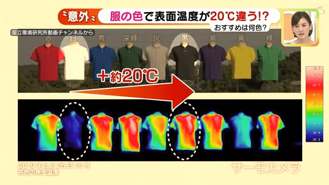 根据实测结果,黑色衣服最吸热!该节目找来国立环境研究所的专家一之濑俊明为这个结果进行分析,一之濑先生认为黑色Tee与白色Tee有这么大的温度差别,主要是因为Tee吸收了多少阳光及反射了多少阳光。“衣服会吸收太阳所发出的热能,而不同颜色的衣服反射热能能力有别,黑色吸收能力最强,但反射能力最弱,就会令衣服表面温度提升。”