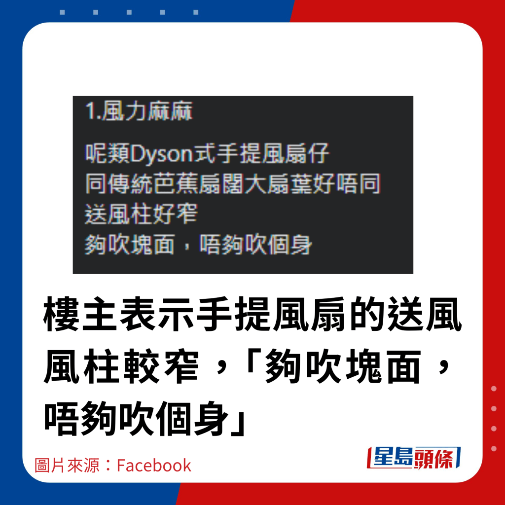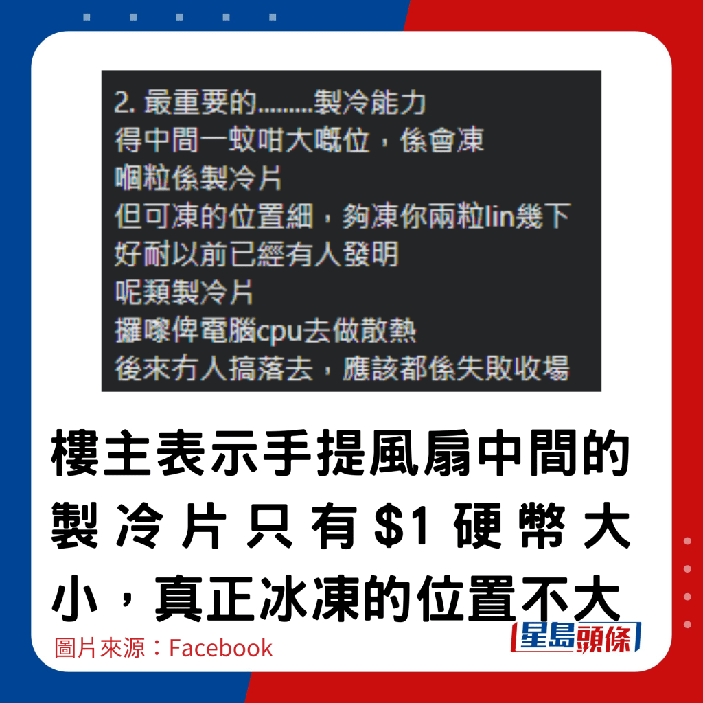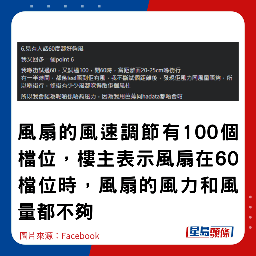 近日有网民在Facebook群组“黄金高登湾电旺电脑场情报关注组( 黄金商场/ 高登商场/ 旺角计算机中心/ 湾仔计算机城/ 298计算机特区)”发文,分享自己对M57制冷手提风扇的用后感,列出6点指该风扇只是“智商税”,警告网民不要买,直言“救得一个得一个”,点击图辑看网民列举6点劝勿购买!
