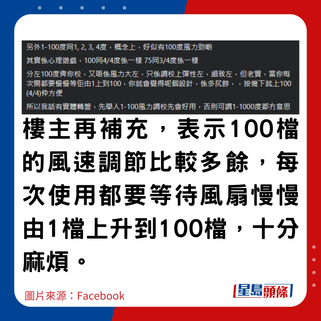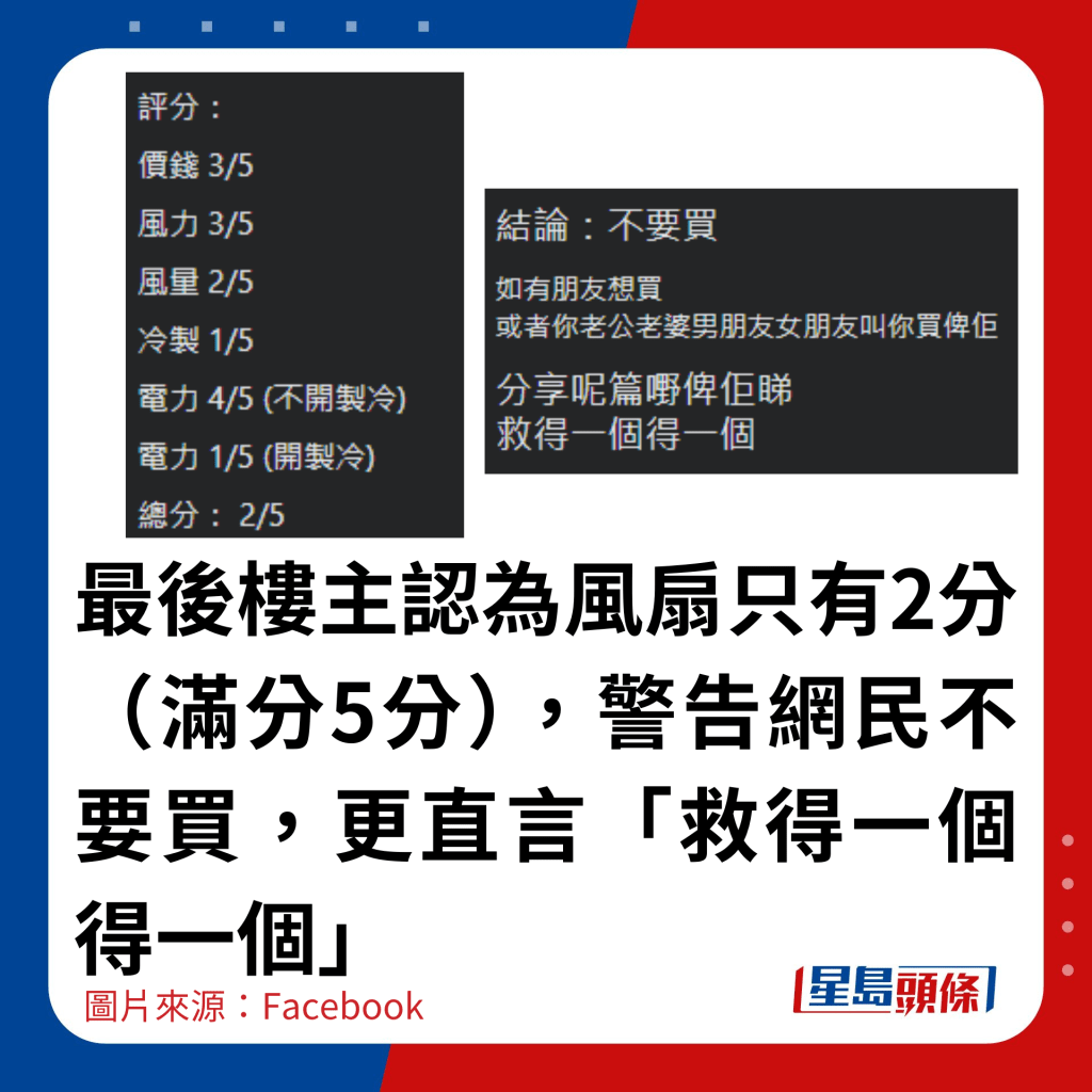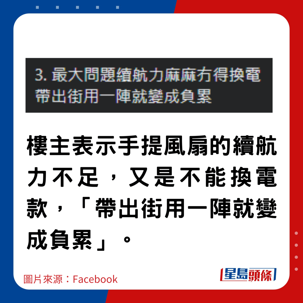 近日有网民在Facebook群组“黄金高登湾电旺电脑场情报关注组( 黄金商场/ 高登商场/ 旺角计算机中心/ 湾仔计算机城/ 298计算机特区)”发文,分享自己对M57制冷手提风扇的用后感,列出6点指该风扇只是“智商税”,警告网民不要买,直言“救得一个得一个”,点击图辑看网民列举6点劝勿购买!