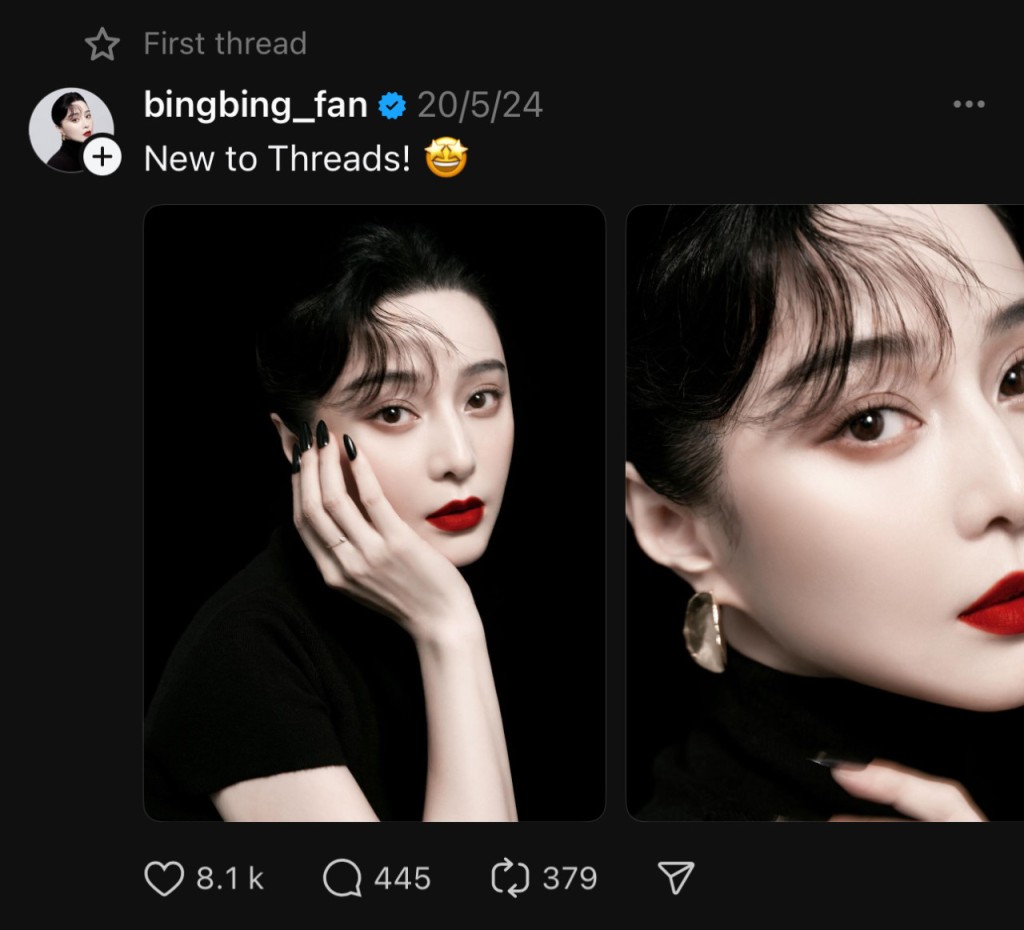 ▲努进军海外市场的范冰冰,最近更惊喜加入Threads,首篇贴文分享了未曾公开的美照。