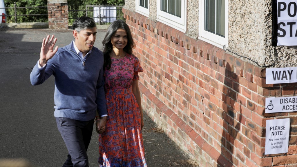 英国首相苏纳克和太太阿克沙塔到他们所属的列治文及诺萨勒顿选区票站投票。苏纳克向现场传媒挥手,但未有发言。据传媒报道,苏纳克私下向朋友表示,担心自己会丧失国会议席。