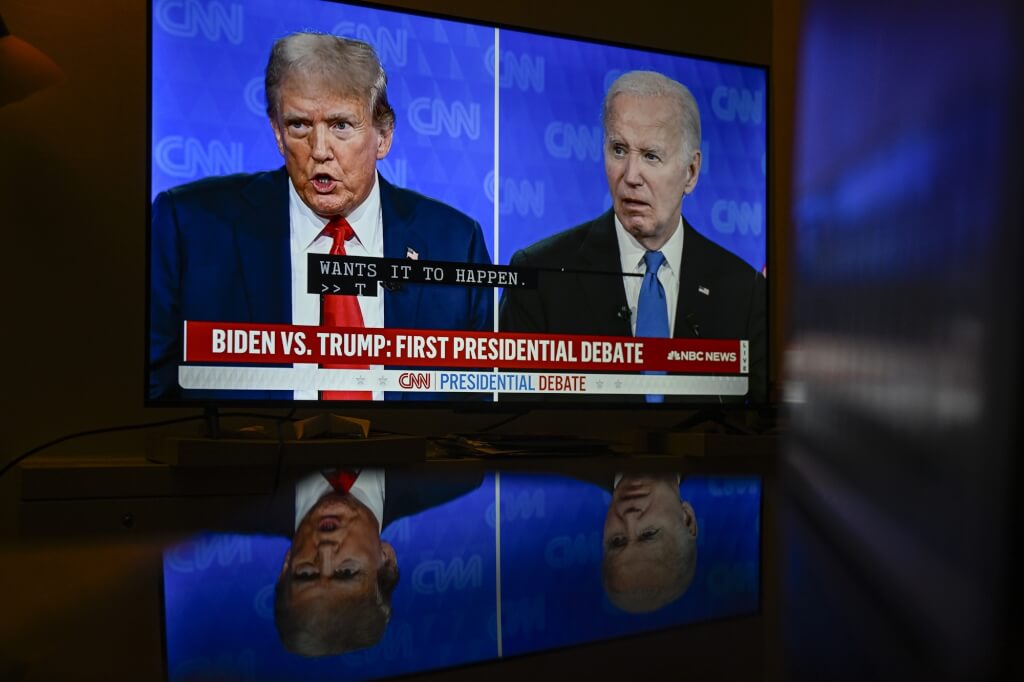 ▲6月27日美国维吉尼亚州一处电视播放拜登(右)和特朗普(左)的首次辩论。(安纳杜鲁新闻社)