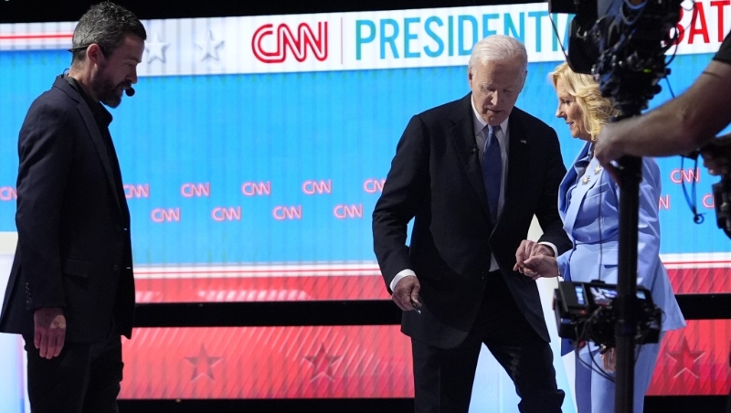 ▲拜登当日完成辩论后,要由妻子扶下只有一级楼梯的讲台。美联社