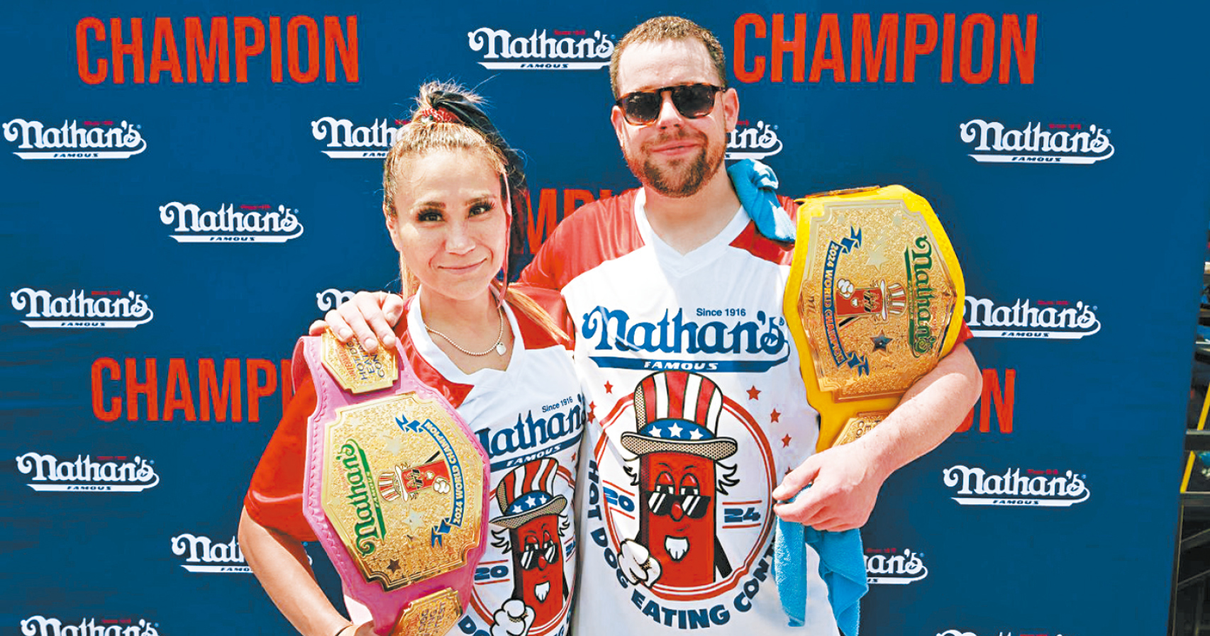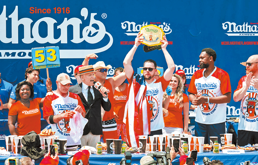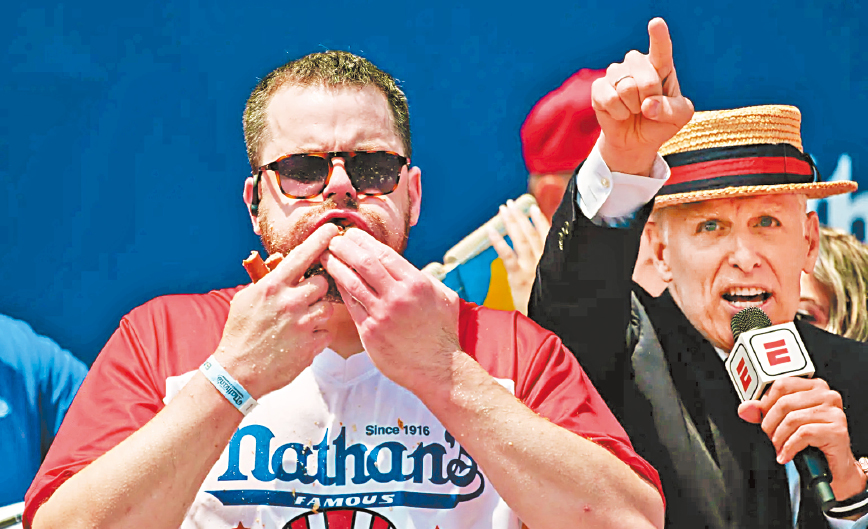 布碌仑康尼岛纳登(Nathan's)国庆吃热狗竞赛,在常胜冠军大白鲨切斯纳特(Joey Chestnut)被禁赛后,昨(4日)有了全新冠军选手,他是来自芝加哥的39岁伯托利迪(Patrick Bertoletti),他在10分钟内吞下58个热狗和面包夺冠,远远低于切斯纳特近年来曾取下的70个以上的惊人成绩。