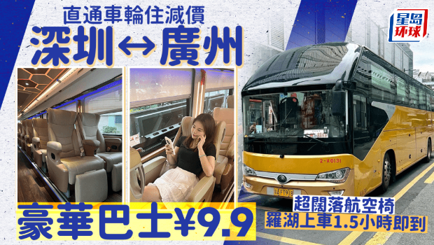 由7月1日开始,“乔巴士”提供深圳往返广州巴士服务,途经深圳及广州主要地铁站,每天逾30班次,大约每隔15分钟就有一班,车程约需1.5小时,车费需9.9元!从多位网民在社交平台上载的相片可见,巴士空间非常宽敞,更设“豪华航空座椅”,不过有内地网民提醒,并非所有班次都设有航空座椅,需按运行车型而定。