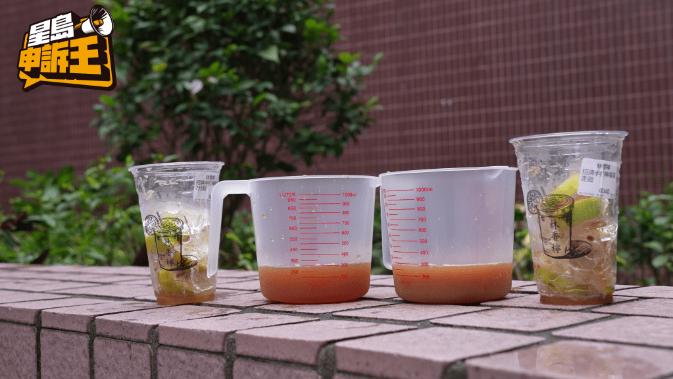 在每间茶店,记者各买了2杯一杯正常冰和一杯少冰的手打柠檬茶,进行实测时,记者首先隔走冰块和柠檬片,再倒入量杯量度实际容量。结果发现,在不少冰的情况下,“林香柠”的茶量是最少,只有300毫升。整杯饮品有一半是冰和柠檬片,其余3间的茶量都至少占杯身七成或以上,其中“茶救星球”就最足料,茶量则占了8成。