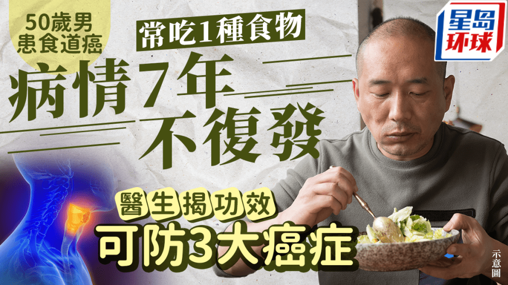 江守山医生后来建议患者改变饮食习惯,一度推荐他采用地中海饮食法,但患者偏爱中式料理,于是江医生改为建议他每两日进食一碟葱花蛋。患者听从建议后,结果成功控制食道癌病情,食道癌在7年内未有复发。