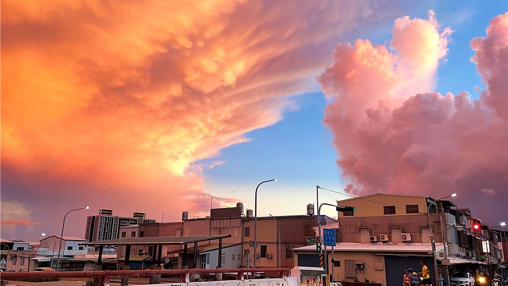 ▲台东傍晚时分出现“火烧云”绝景,不同视角可见红色、橙色、金色和粉色等色彩变幻。中时