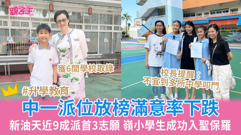 面对结果,有人欢喜有人愁。油麻地天主教小学(海泓道)今年有89%学生获派首三志愿。校长陈淑仪表示今年满意率下跌有两大原因,包括家长选校比以往更进取,以及高才通令有更多学生从内地来港就读,参与升中派位人数增加,令满意率下跌,但认为跌幅轻微。至于叩门,陈校长提醒家长宜抱持平常心,不宜到太多学校叩门,以免影响子女自信心,增加家长及学生压力;又称即使未能获派心仪中学,只要在中一努力争取好成绩,一样有机会插班至心仪的学校。