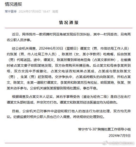 据九派新闻报道,常宁宣传9日发通报,就6月30日发生的教师及公务员偷豆角事件,公开调查结果。
