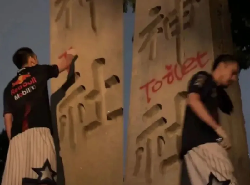 ▲数名中国男子在日本靖国神社石柱上便溺涂污,其中一人已遭到日本东京警视厅逮捕。(图/微博)