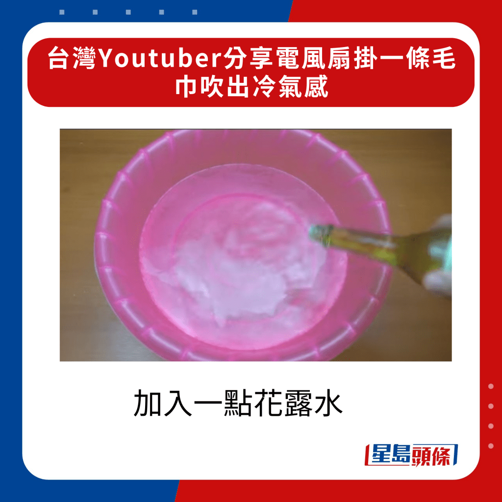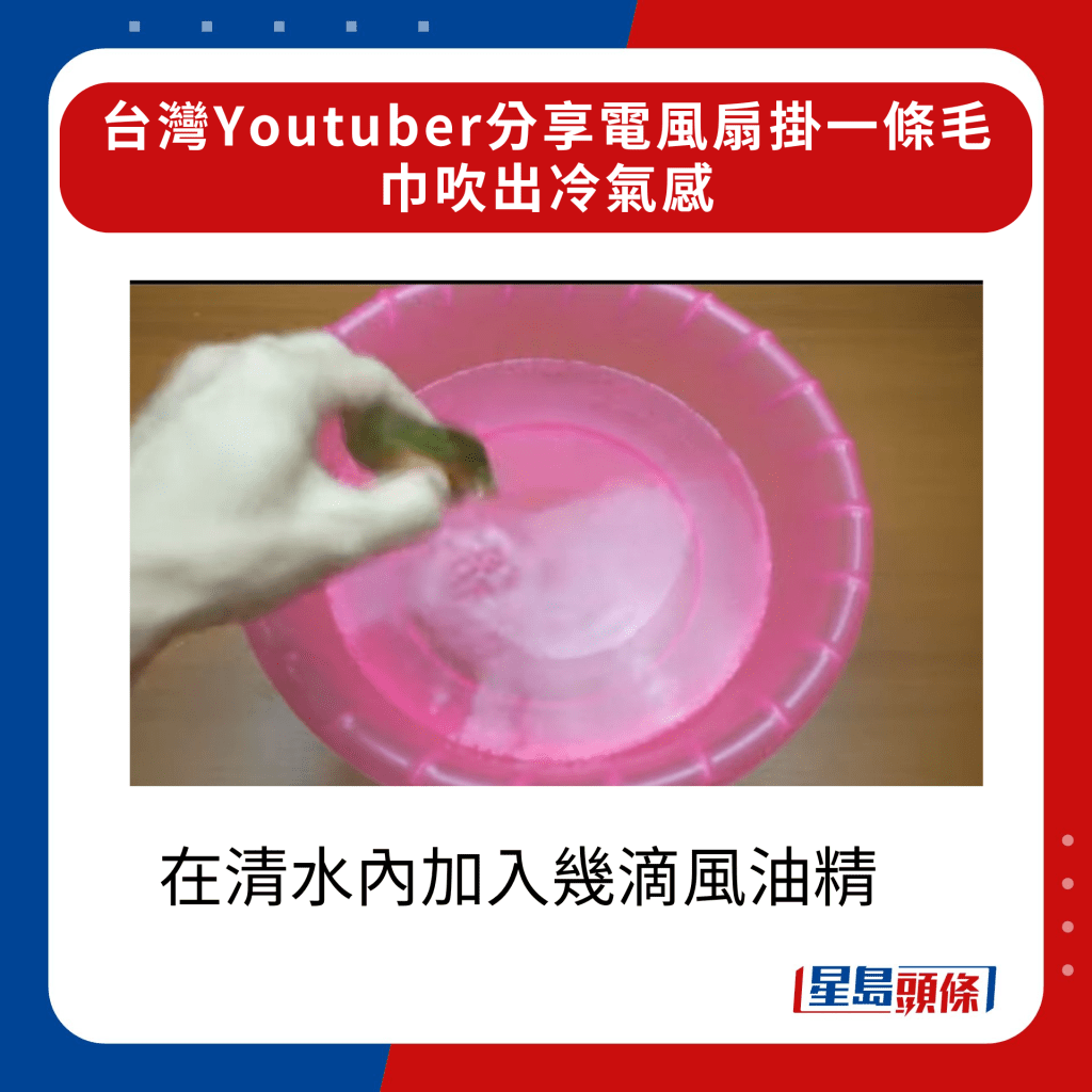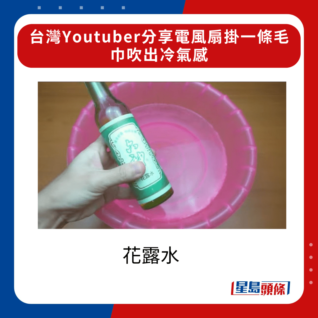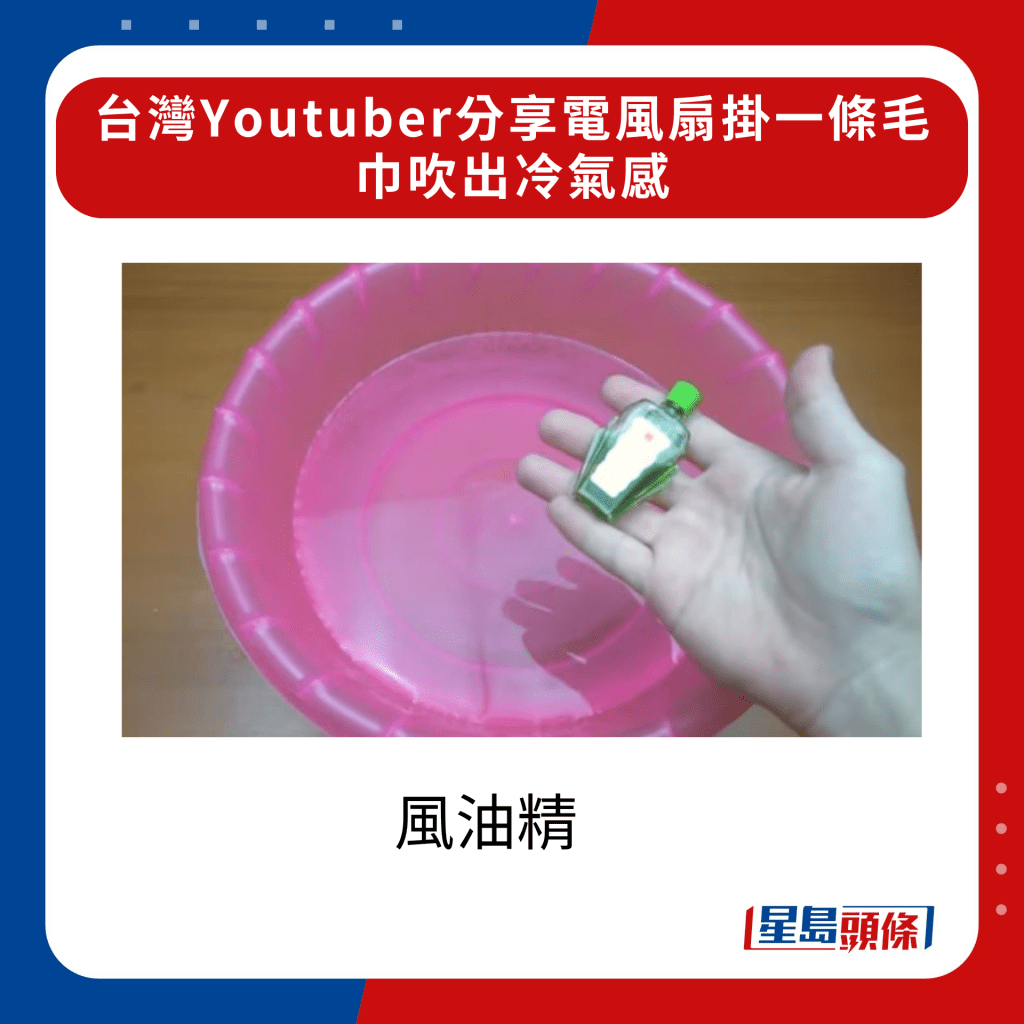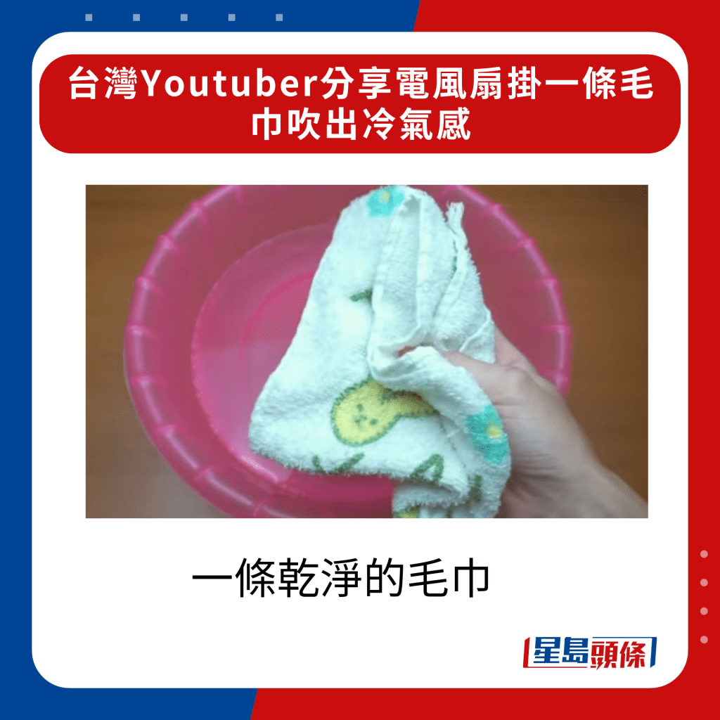 一位名为“妙招小哥”的台湾YouTuber,经常出片分享生活小妙招和生活小智慧,早前他便以“电风扇挂一条毛巾,吹出来的风和空调一样凉快!每个月节省不少电费,不学起来就亏大了!”为名,分享了以一条毛巾,配搭清水、风油精及花露水,即可令风扇吹出来的热气变凉快的妙招,按图辑了解详情。