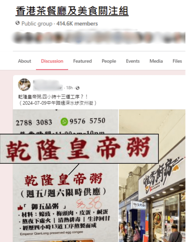 ▲有网民发现 小店在卖一道菜叫 “乾隆皇帝粥”。图片来源:香港茶餐厅及美食关注组@Facebook