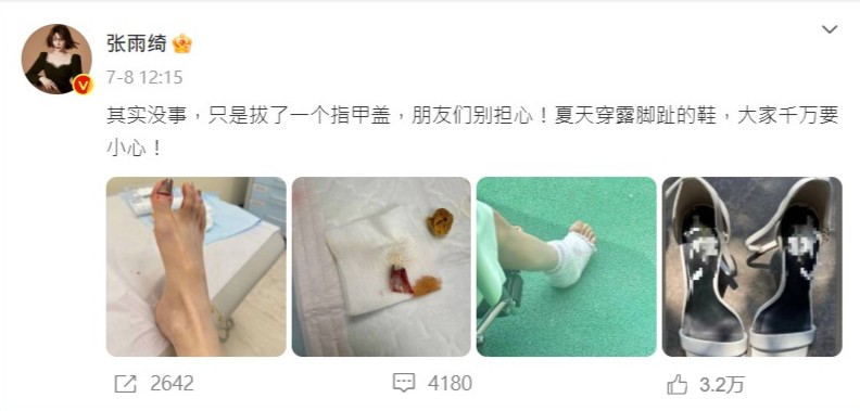 张雨绮日前在微博上载坐轮椅的照片,见到她的右脚拇指上有明显的损伤,张雨绮透露穿凉鞋时不慎伤到脚趾,要将脚甲拔除。张雨绮贴出受伤及脚甲的照片留言:“其实没事,只是拔了一个指甲盖,朋友们别担心!夏天穿露脚趾的鞋,大家千万要小心!”