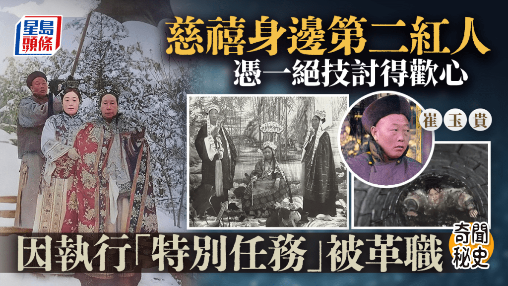 清朝慈禧太后最宠信的,除了大太监李莲英外,便是太监二总管崔玉贵。崔玉贵能成为慈禧座前第二红人,除了有太监必备的做事细心、“识睇眉头眼额”等专才外,还因生得精壮大大只,识功夫,被挑选学戏做武生,靠这连李莲英也不如的声艺,成功赢得“老佛爷”欢心。