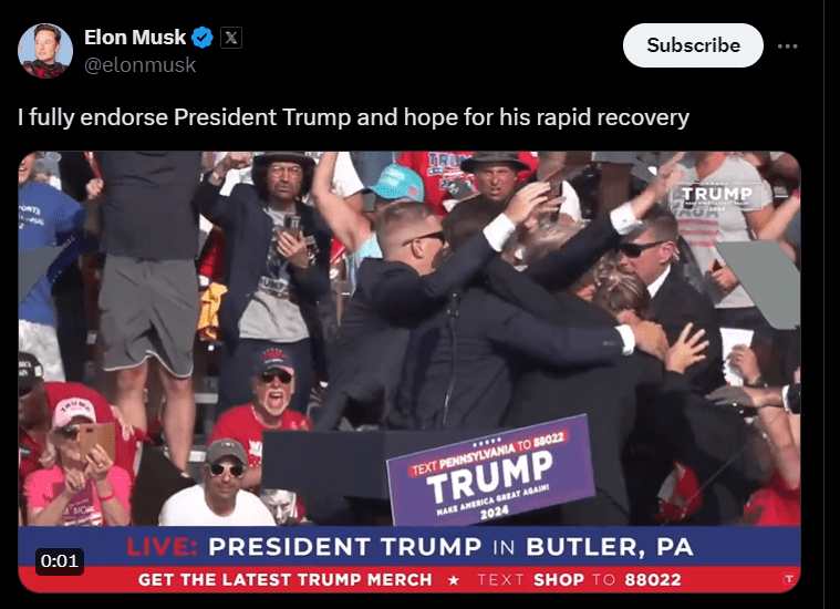 特朗普遭遇枪击事件后,马斯克随即在X发文:“我全力支持特朗普,并期望他迅速康复。”