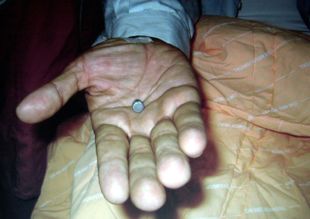▲奇美医院发布照片﹐展示陈水扁身体和衣服之间发现的弹头。 美联社
