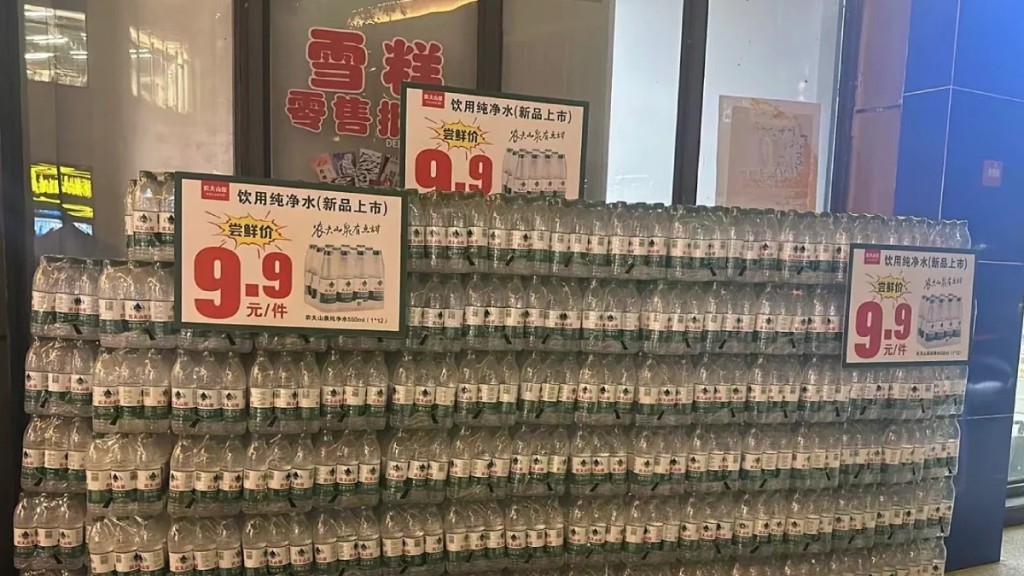 继内地连锁冰饮店蜜雪冰城推出1元人民币“雪王冰杯”震撼市场后,樽装水近日同样爆发价格战,农夫山泉、怡宝、娃哈哈等樽装水龙头,纷纷大劈价,令整个樽装市场齐齐割价竞争,550毫升装平均只需0.41元人民币一瓶。