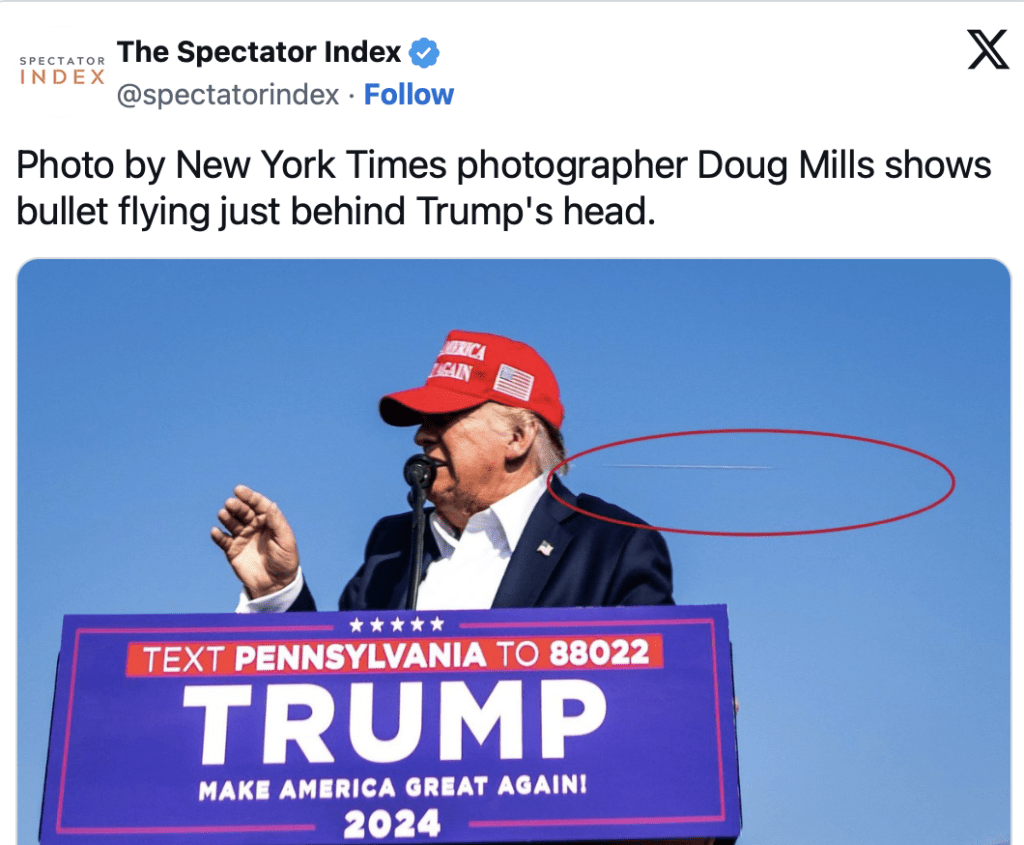 ▲《纽约时报》(The New York Times)资深摄影记者米尔斯(Doug Mills)疑似拍到子弹在特朗普头部附近呼啸而过的震撼画面。社交平台X截图