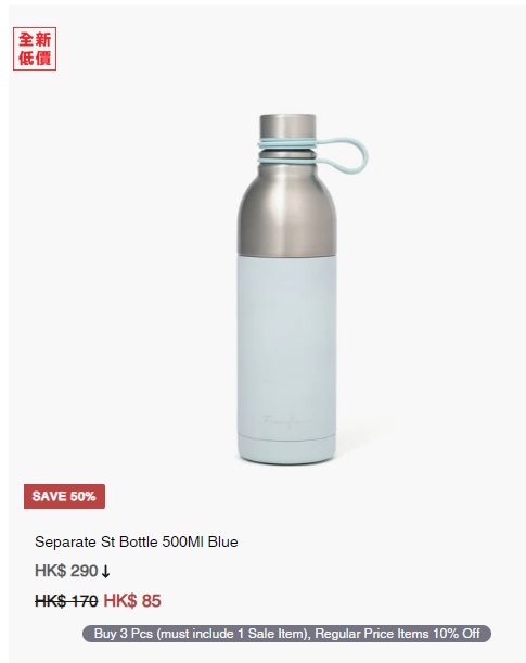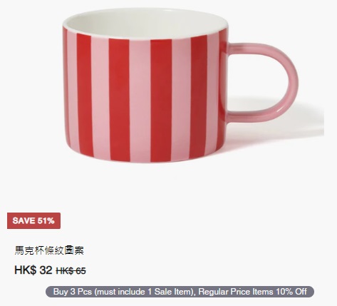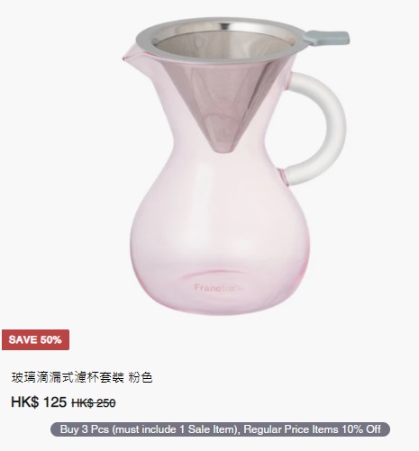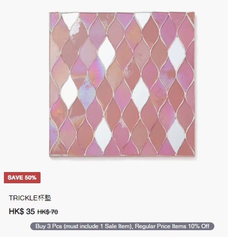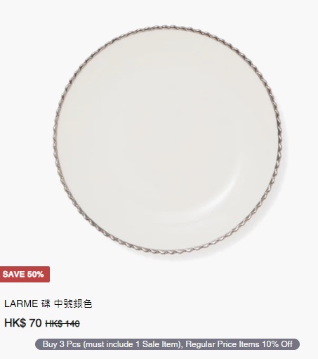 Francfranc的餐具与厨房用品一向抵用,日本品牌美浓烧餐碟、饭碗69折后只售$47起,造型简约且颜色梦幻,适合文青风格一族。至于女生喜欢的英式下午茶用具亦有减价,FLOWER FRILL三层玻璃蛋糕架原价$380,现以半价$190发售,最适合与三五知己在家舒服叹下午茶。此外,不同餐设计、纹路餐碟现售$40起。