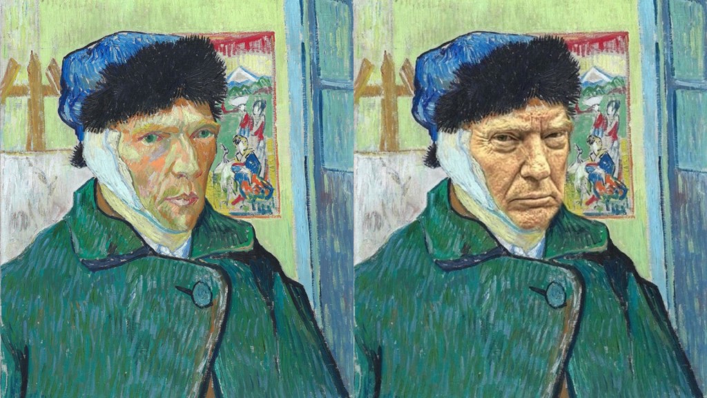 有网友将梵高耳朵包纱布的自画像P成特朗普的脸,X平台其中一幅作品多达4百万次浏览、5.5万人赞好。