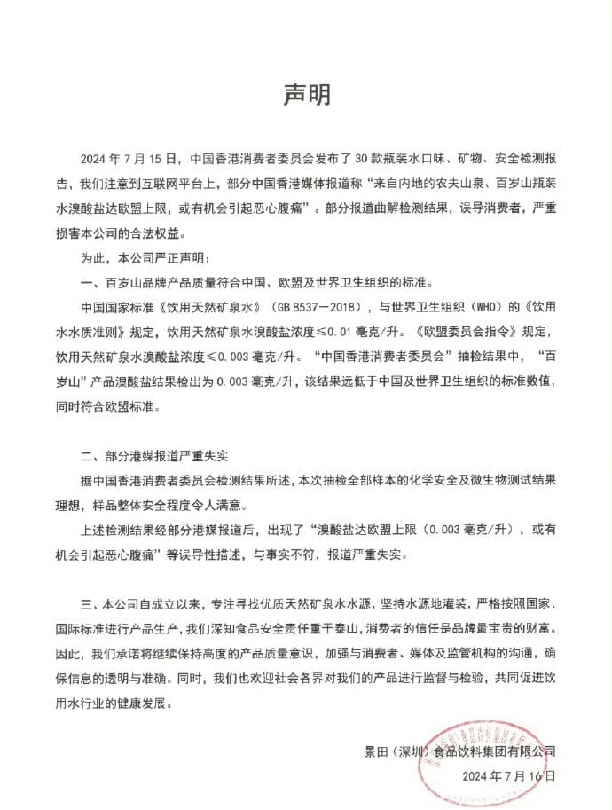 同样被消委会点名指溴酸盐含量达欧盟上限的“百岁山”发声明,强调其产品检测出的溴酸盐含量为每公升0.003毫克,远低于国家及世衞标准数值,符合欧盟标准。