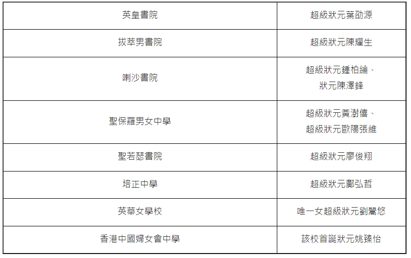 据《星岛》了解,今届中学文凭试的10名状元来自8间学校,其中,圣保罗男女中学及喇沙书院各有两名状元诞生,其他6名状元分别就读香港中国妇女会中学、英皇书院、圣若瑟书院、英华女学校、拔萃男书院等学校。其中,西湾河的香港中国妇女会中学首次诞生状元。