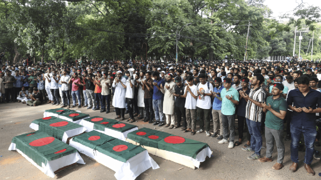 ▲反对公务员聘用配额的学生在达卡大学举行了一场模拟葬礼,以纪念在冲突中丧生的人们。 (美联社)