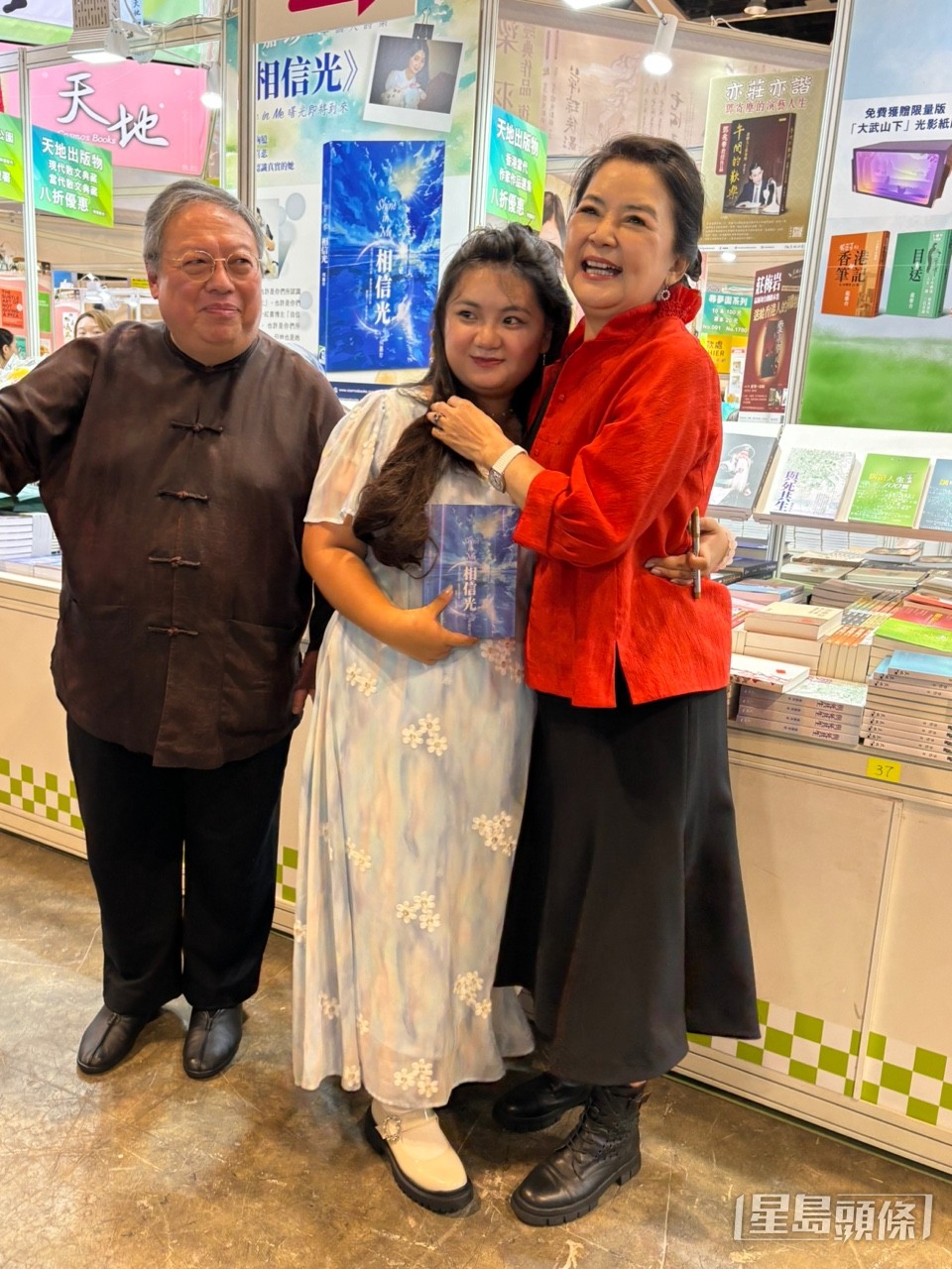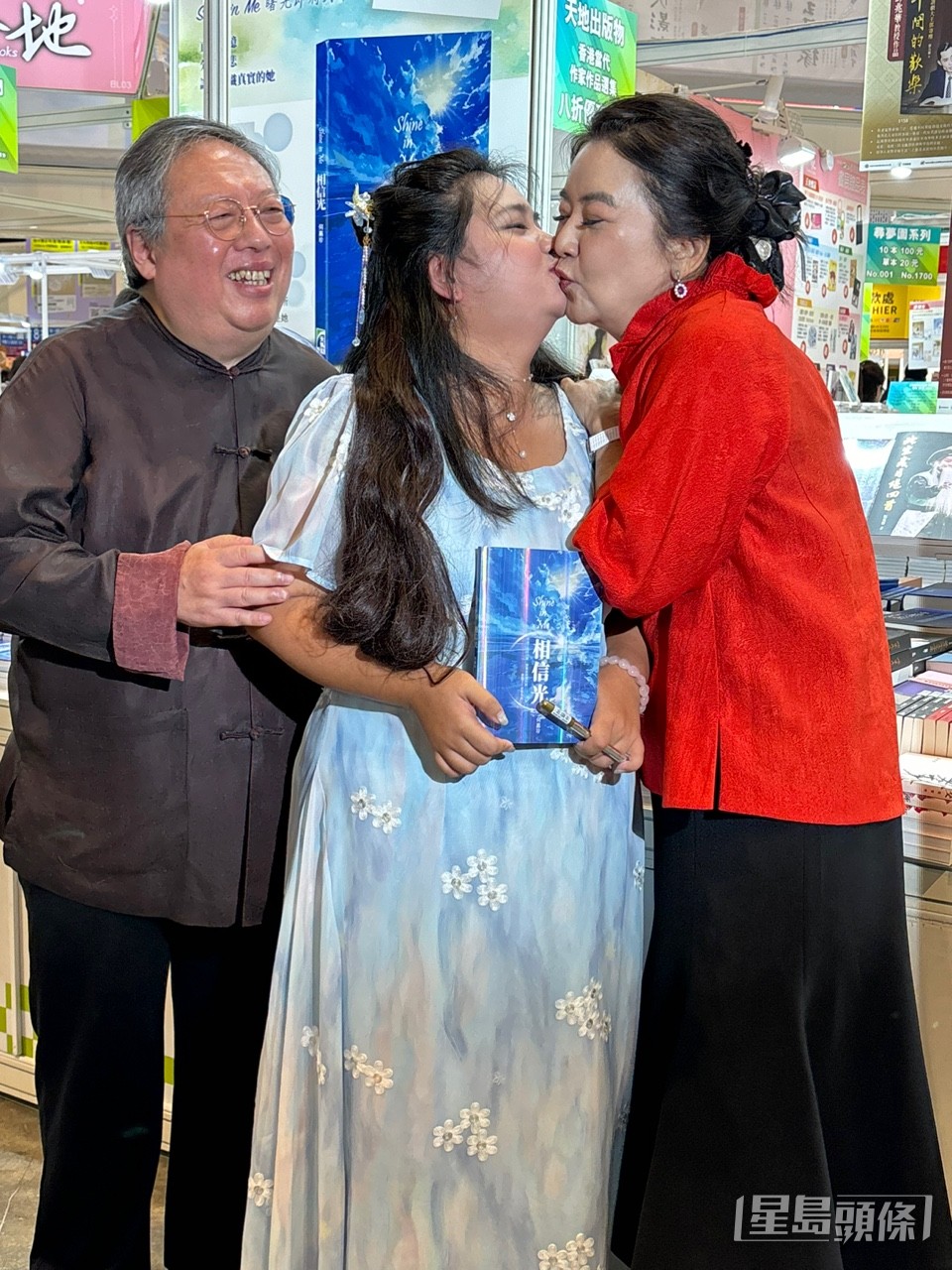胡慧中与前民政事务局局长何志平的女儿何嘉珍推出首本个人诗集《相信光》,今日(17日)到书展宣传新书,父母和嫲嫲都有来到支持,父母更吻贺她送祝福。