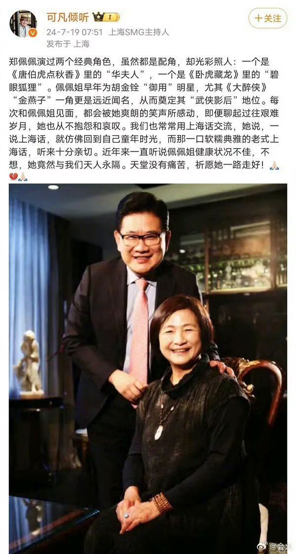 ▲今日内地主持人曹可凡在社交平台发文哀悼郑佩佩,指她已经逝世,震惊娱乐圈。