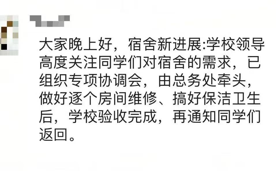 7月18日,小白告诉澎湃新闻,导师发布通知称,学校已高度关注此事。 小白提供的聊天记录截图显示,学校称,“将会给学生们重新修缮宿舍,等学校验收通过后,再通知学生返回”。