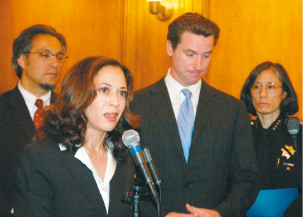 ▲哈里斯2005年时任旧金山地检官与时任旧金山市长纽森等出席记者会。本报资料图片