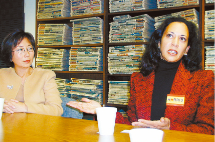▲哈里斯2003年竞选地检官,选前在时任估值管邓式美(左)陪同下来访星岛日报宣传政见。本报资料图片