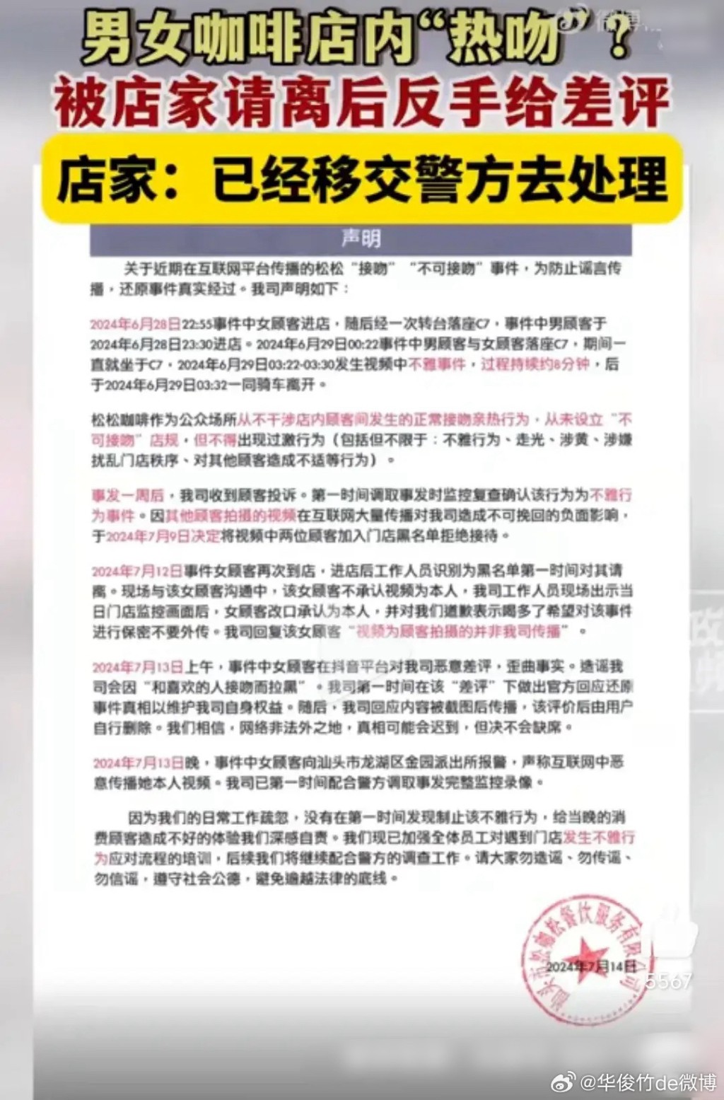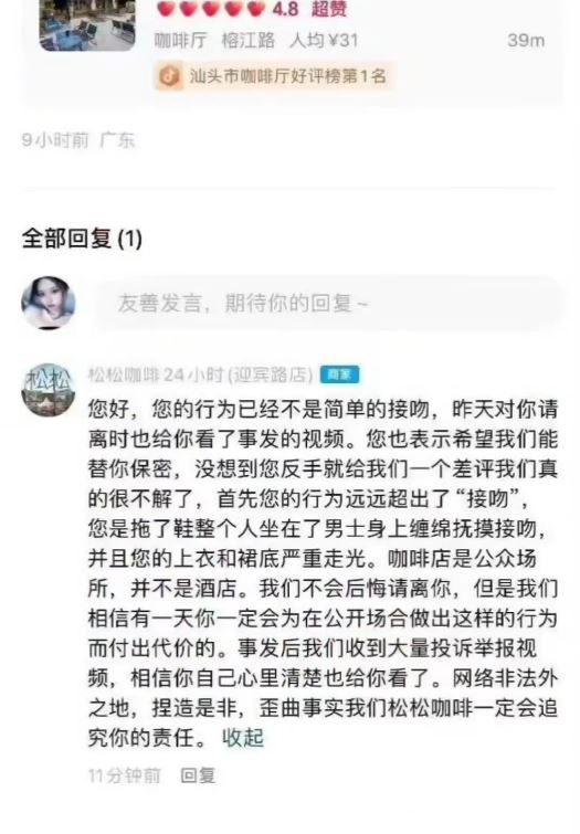 广东汕头有咖啡店驱赶激情热吻顾客后,被女事主在网上留下差评,扬言要店家后悔,引发双方在网上骂战,令事件在近日发酵曝光,更惊动警方介入。