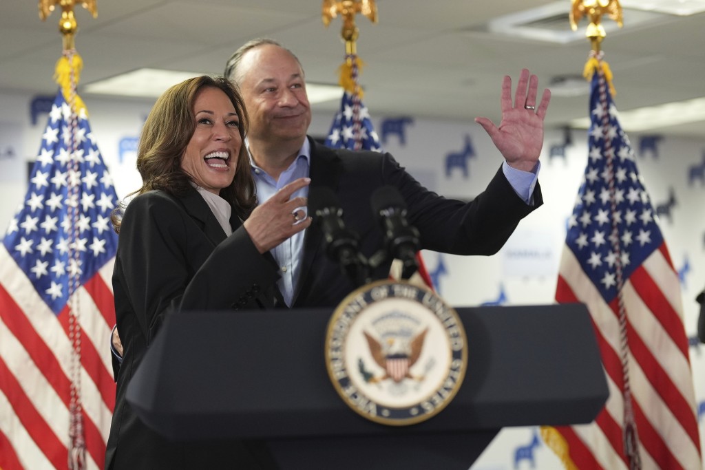 ▲哈里斯与丈夫任德龙一同上台。美联社