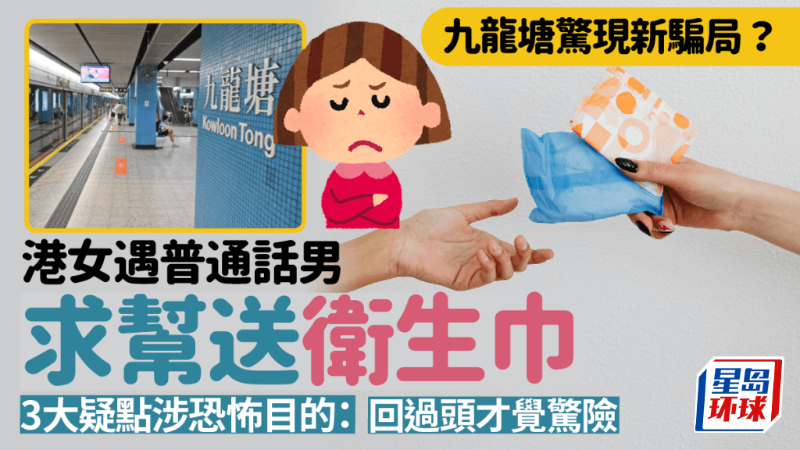 九龙塘惊现新型拐骗手法? 最近有小红书网民分享在九龙塘区遇到的奇怪经历,有一名陌生男子声称女朋友需要卫生巾应急,希望事主可以帮忙送到洗手间。 当时事主因身上没有卫生巾而婉拒,惟打算折返帮忙时,发现该名男子行色匆匆,状甚可疑,于是想起内地网络上曾流传类似的骗案手法,并惊觉今次事件出现3大疑点,希望提醒附近学校的女生要多加小心注意!
