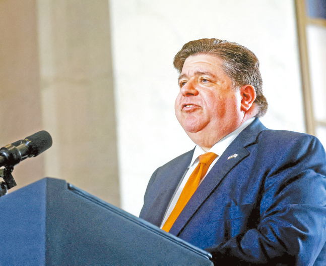 ▲伊利诺州州长普瑞茨克去年中在拜登来访时发表演讲。今天,伊州长的动向成关注点之一。 资料图片路透社