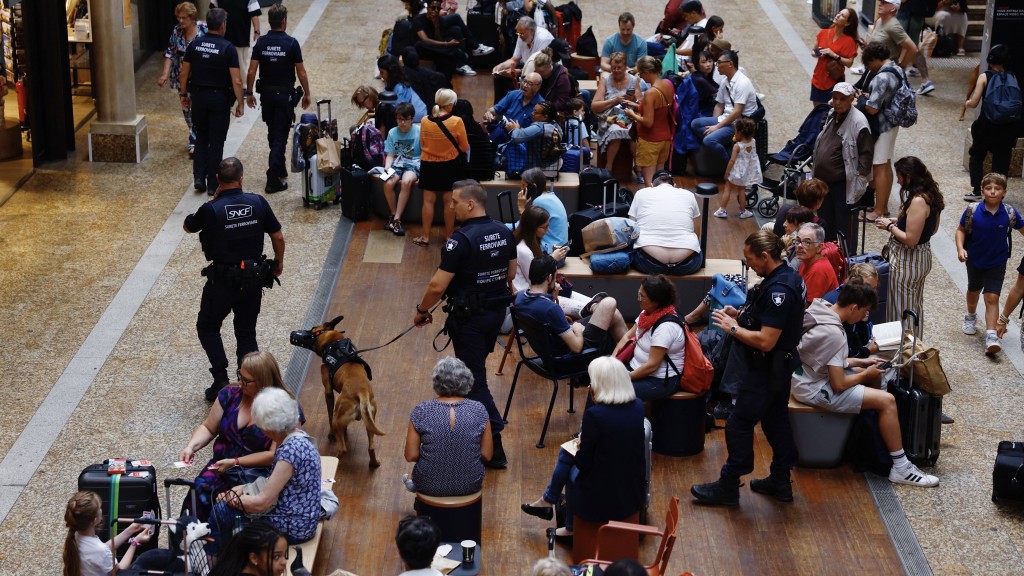 ▲法国高铁TGV破坏事件发生后,波尔多圣让站维安人员巡逻。 路透社