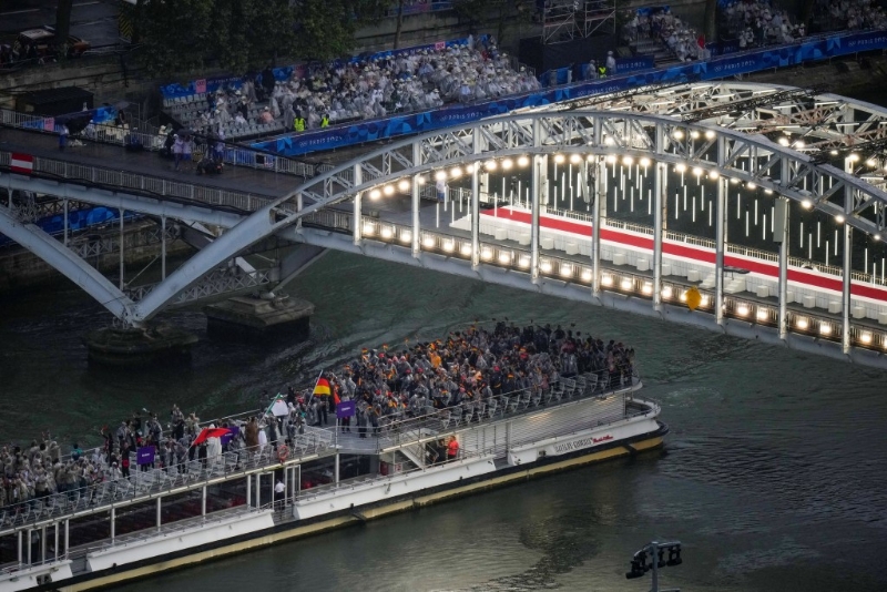 开幕式在当地时间晚上7时30分(北京时间周六凌晨1时30分)开始,历时4个小时,是奥运史上首个不在体育场内举办的开幕庆典。来自逾200个代表团的成员乘坐85条游船沿塞纳河进行6公里巡游,途经巴黎圣母院、罗浮宫等地标建筑,最终抵达与埃菲尔铁塔相呼应的开幕式主会场夏乐宫。
