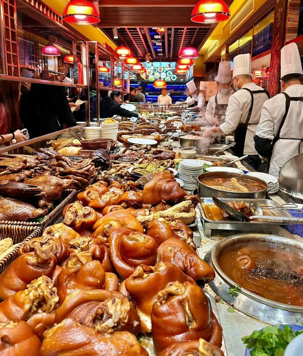 ▲汕头打卡美食攻略2024|3. 吴记富苑 客人在十几米长的排档自选生熟打冷美食,海鲜、卤水、生腌、特色小吃等几百种,必吃隆江猪脚。(图片来源:小红书@椰椰子ye)