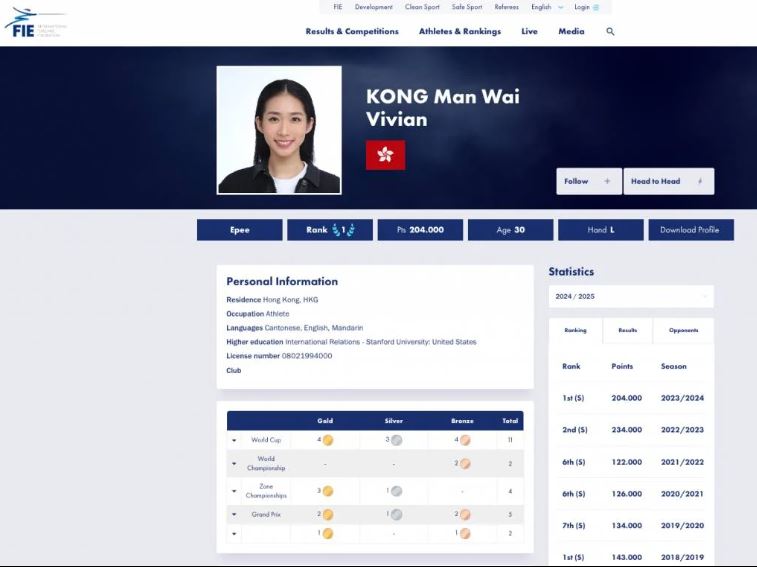 现时世界排名第一 、有“微笑剑后”之称的江旻憓不仅剑击一流,而且还是一名学霸,毕业于斯坦福大学,其后攻读中国人民大学法律硕士、香港中文大学法律博士(J.D.),样子甜美的江旻憓,遗传了妈妈的优良基因,早年曾被网民留言称与“台湾第一名模”林志玲撞样,形容为“剑击界林志玲”。江旻憓私下生活朴素,与平常人一样,经常会在社交平台分途她的生活日常及剑击练习照等,不过江旻憓曾在访问上表示,因尴尬的关系,她不享受面对镜头,亦甚少翻看自己的访问片段和相,而IG上的相片全出自妈妈,江妈妈曾说:“佢唔畀我影,我有时趁佢唔为意,偷偷地影。(他不让我影,我有时趁他不为意,偷偷地影。)”